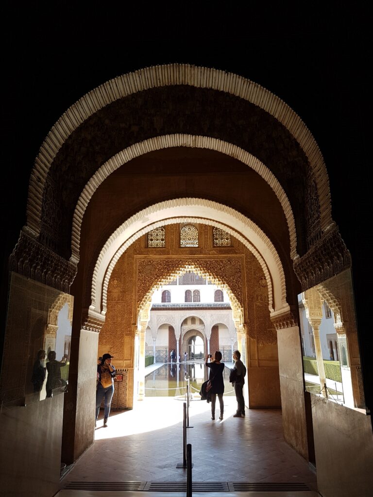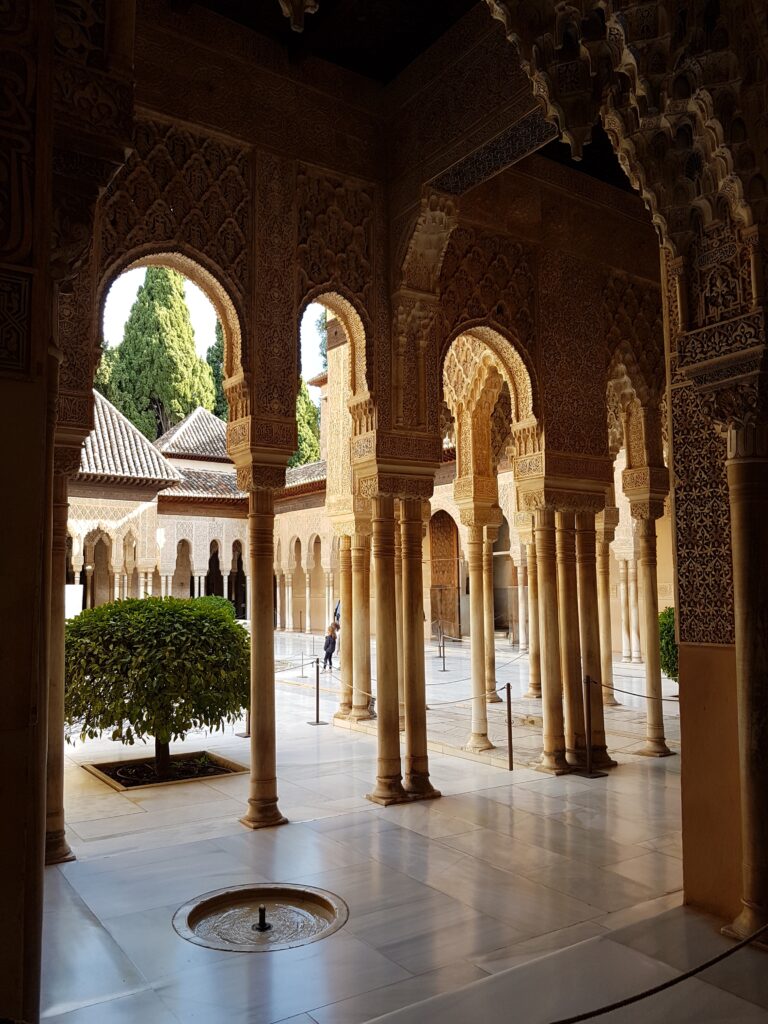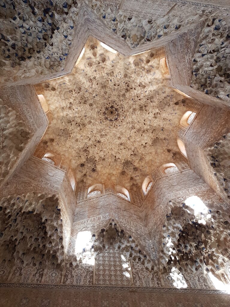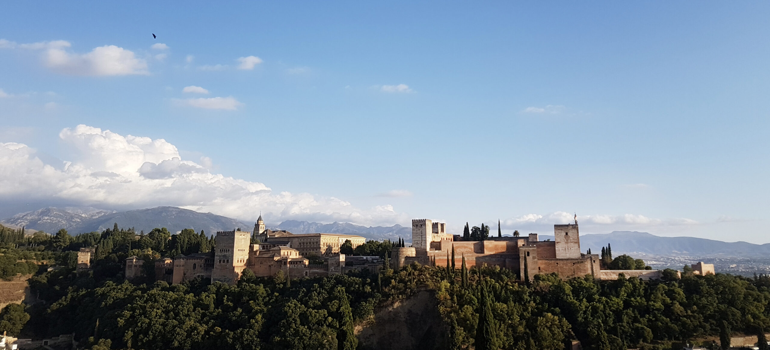 Botladozva járkáltunk fel s alá a városban, mert mindig akadt egy csodálatos kilátás, pálmafás parkok, díszes épületek vagy megcsodálni való naplemente, annyi, hogy nem maradt időnk a lábunk elé nézni. Utólag meg is állapítottuk az erasmusos kollégáimmal, hogy ez a város bizony egy nagy kilátóra épült. Nem véletlenül tartják a mór kultúra ékkövének, hisz sok minden maradt hátra azokból a virágzó időkből. Kihagyhatatlan látogatási célpont az Alhambra templom, amely esetünkben egy egész napos programnak bizonyult. A járvány miatt szinte egyáltalán nem voltak turisták, s úgy tűnt, egy kis ideig teljes betekintést nyertünk a történelembe. Számunkra különösen hízelgő volt ez a szerencsés alkalom, hiszen a műhelyben, ahol szerződtetve voltunk, eredeti Alhambra díszítéseket és motívumokat kreáltunk újra, és festettünk meg teljesen a nulláról.